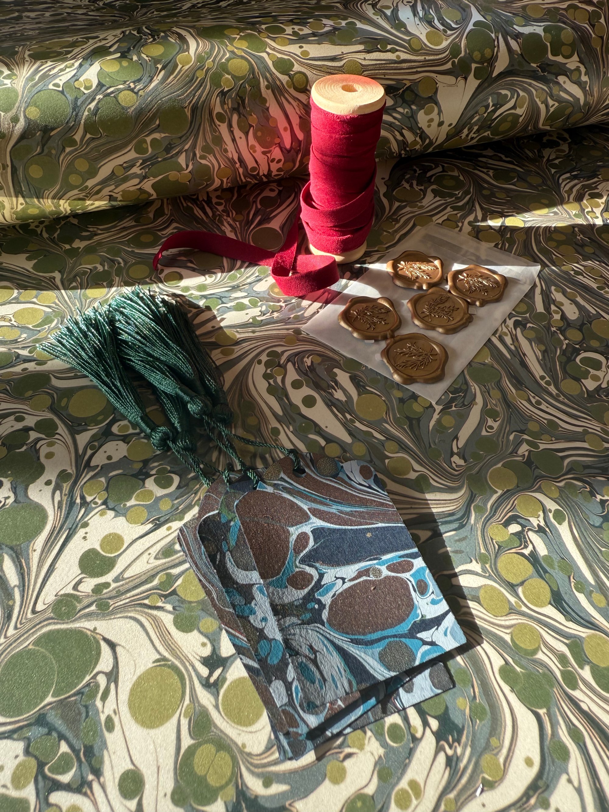 A gift wrapping bundle based around our pearlescent 'Aventurine' printed marbled paper.