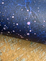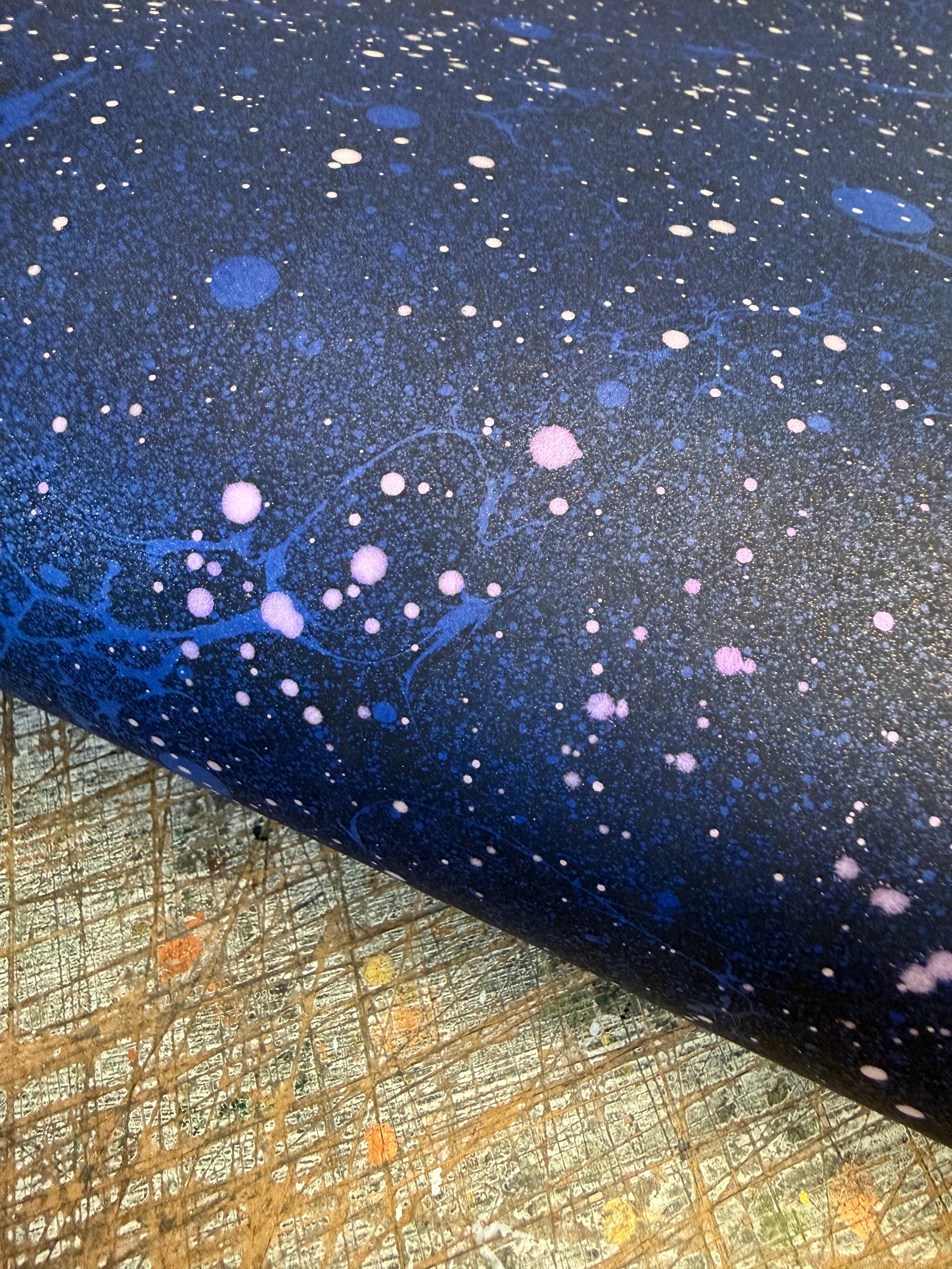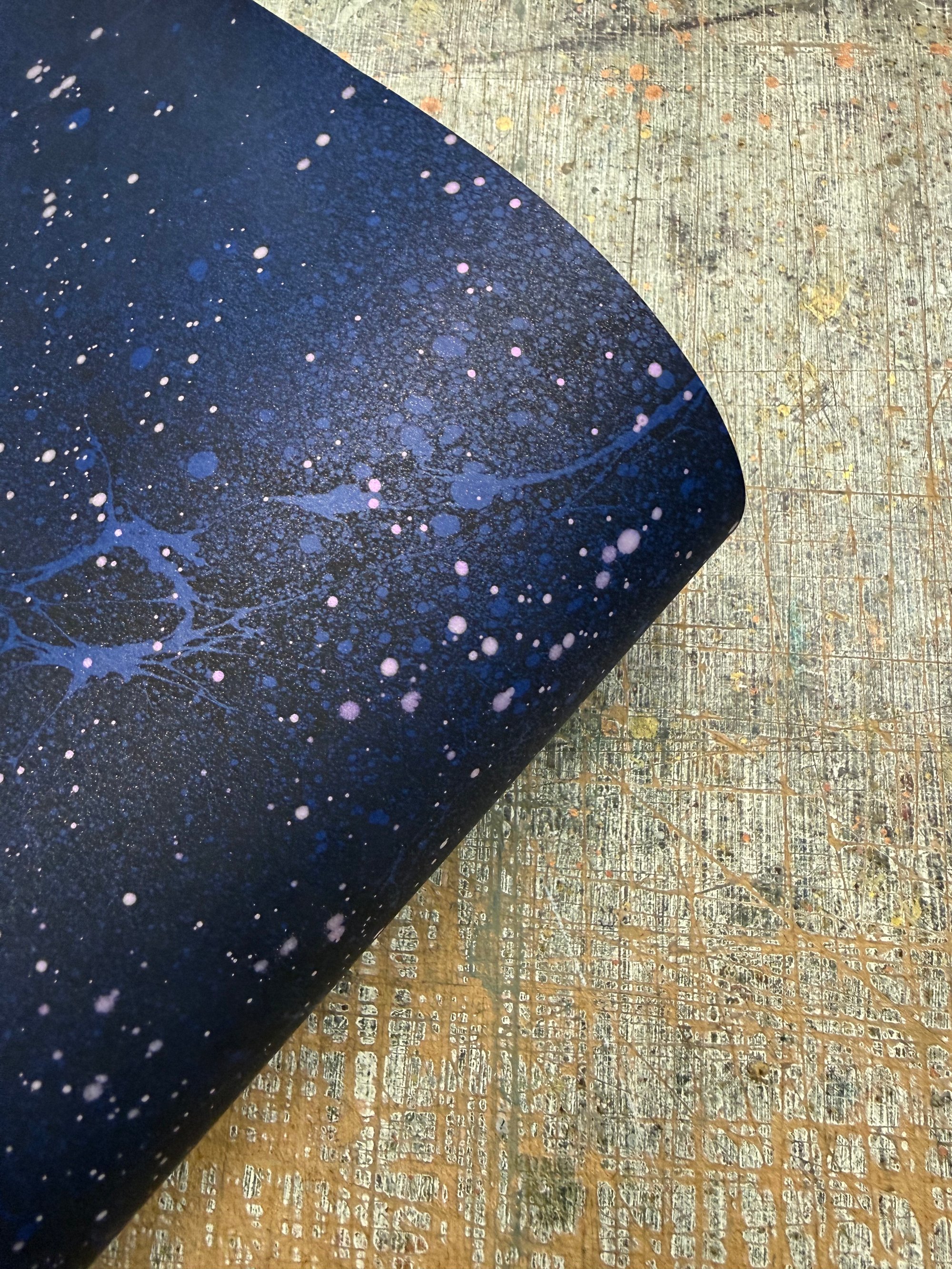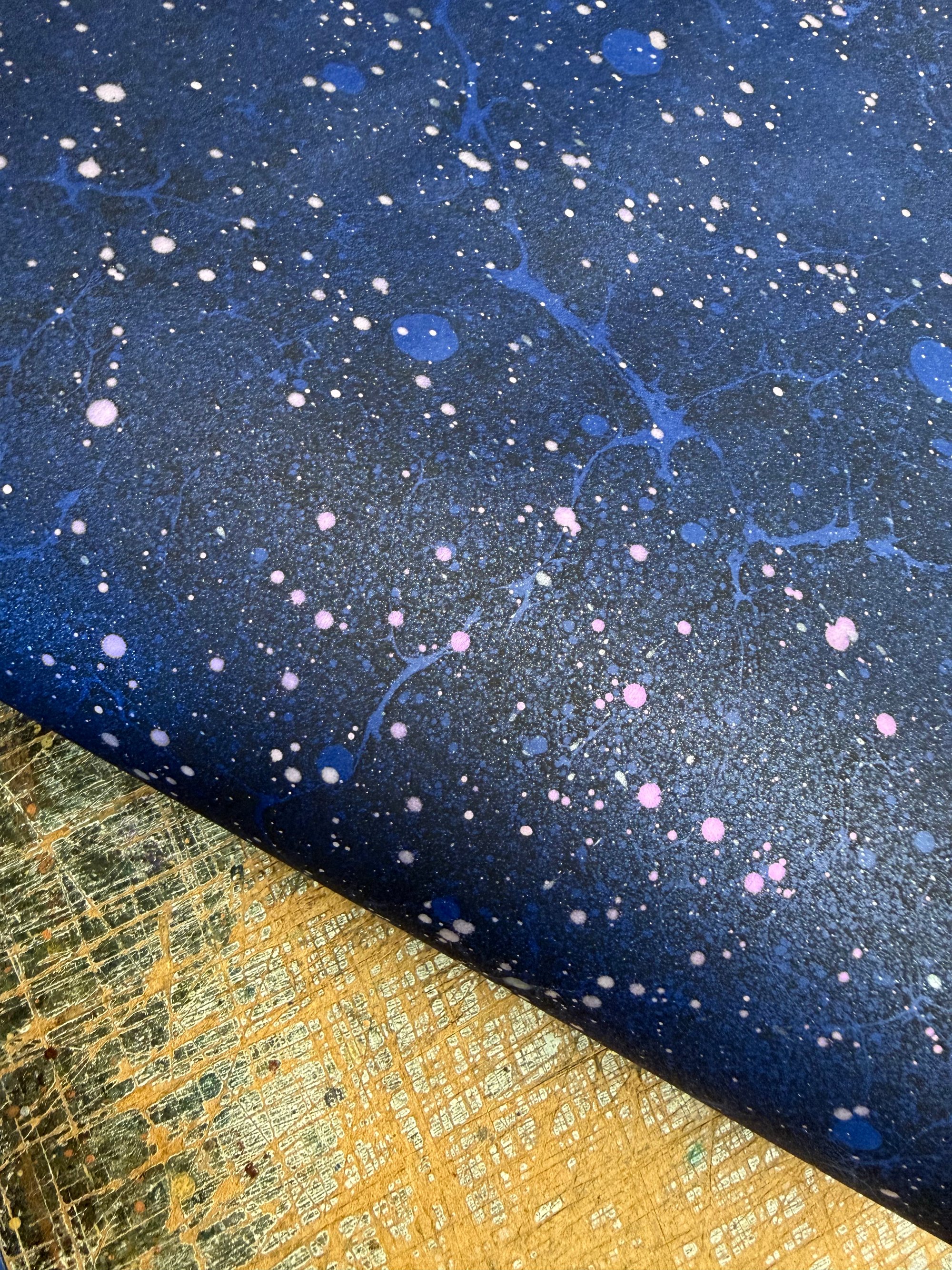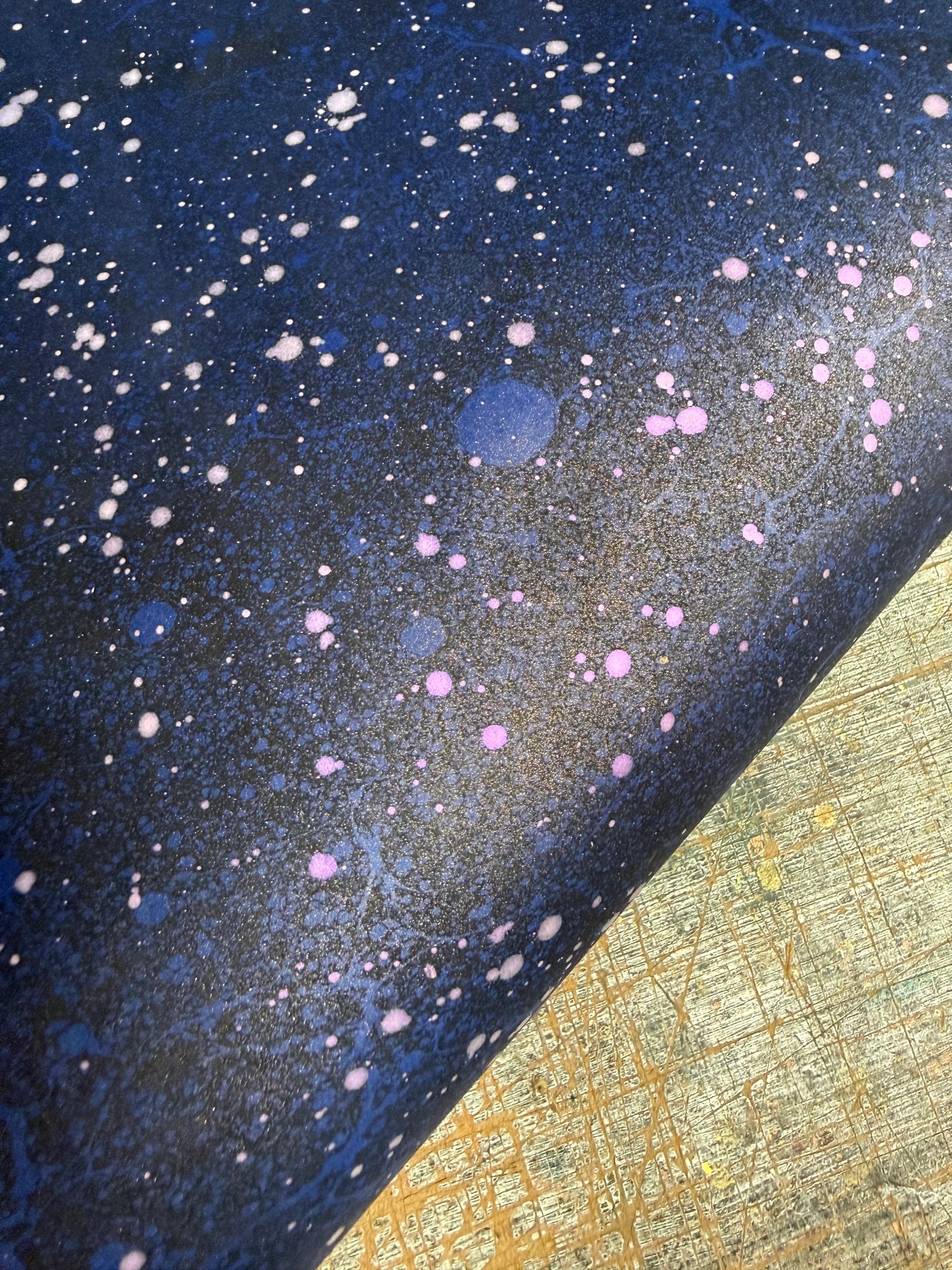 A Space inspired hand marbled paper on blue base paper which has been hand splattered with interference violet paint once dried and then finished with a mist of shimmer, which catch the light beautifully.