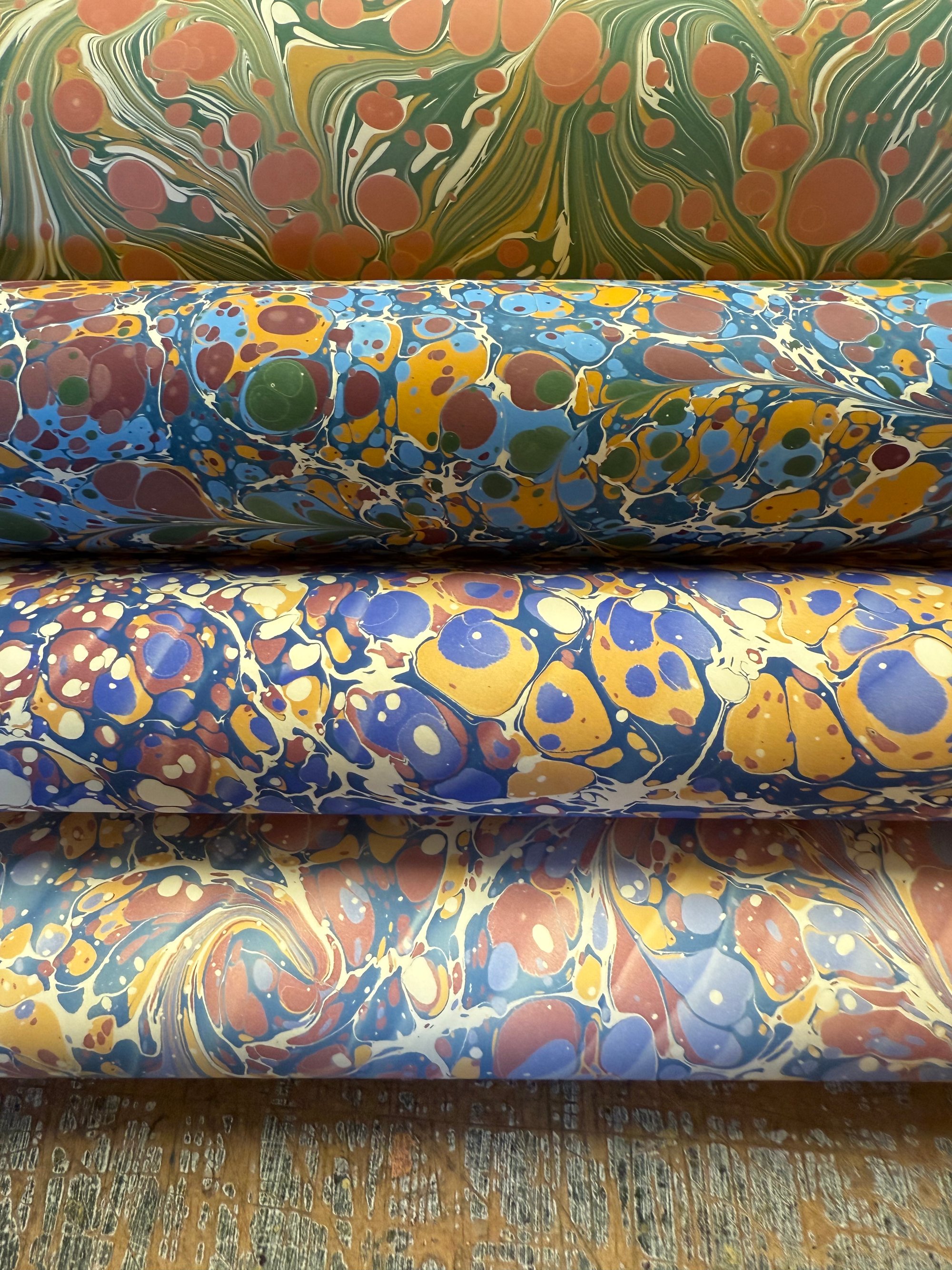 This is our opportunity to show and sell the many sheets of assorted first quality hand marbled papers that we have available. The emphasis here is on bringing you as many paper options as possible and to do this we have to keep the listings and photographs as simple as possible.