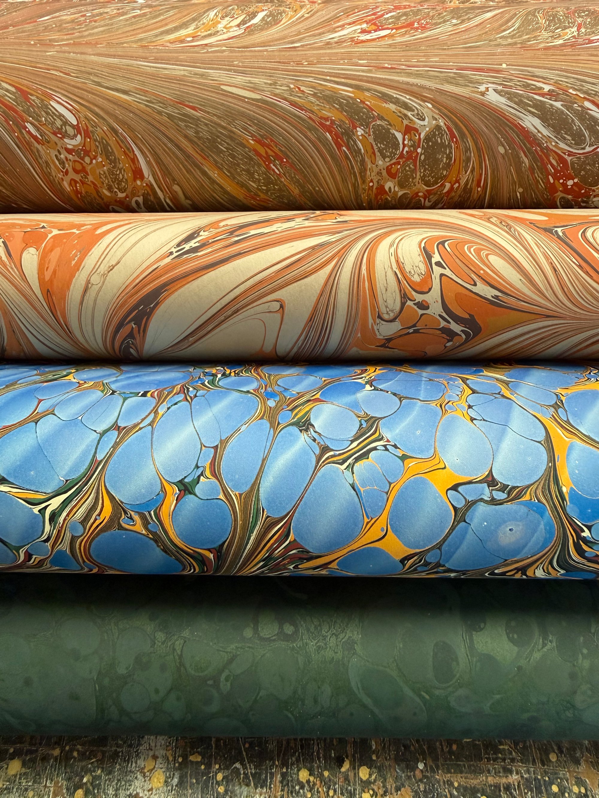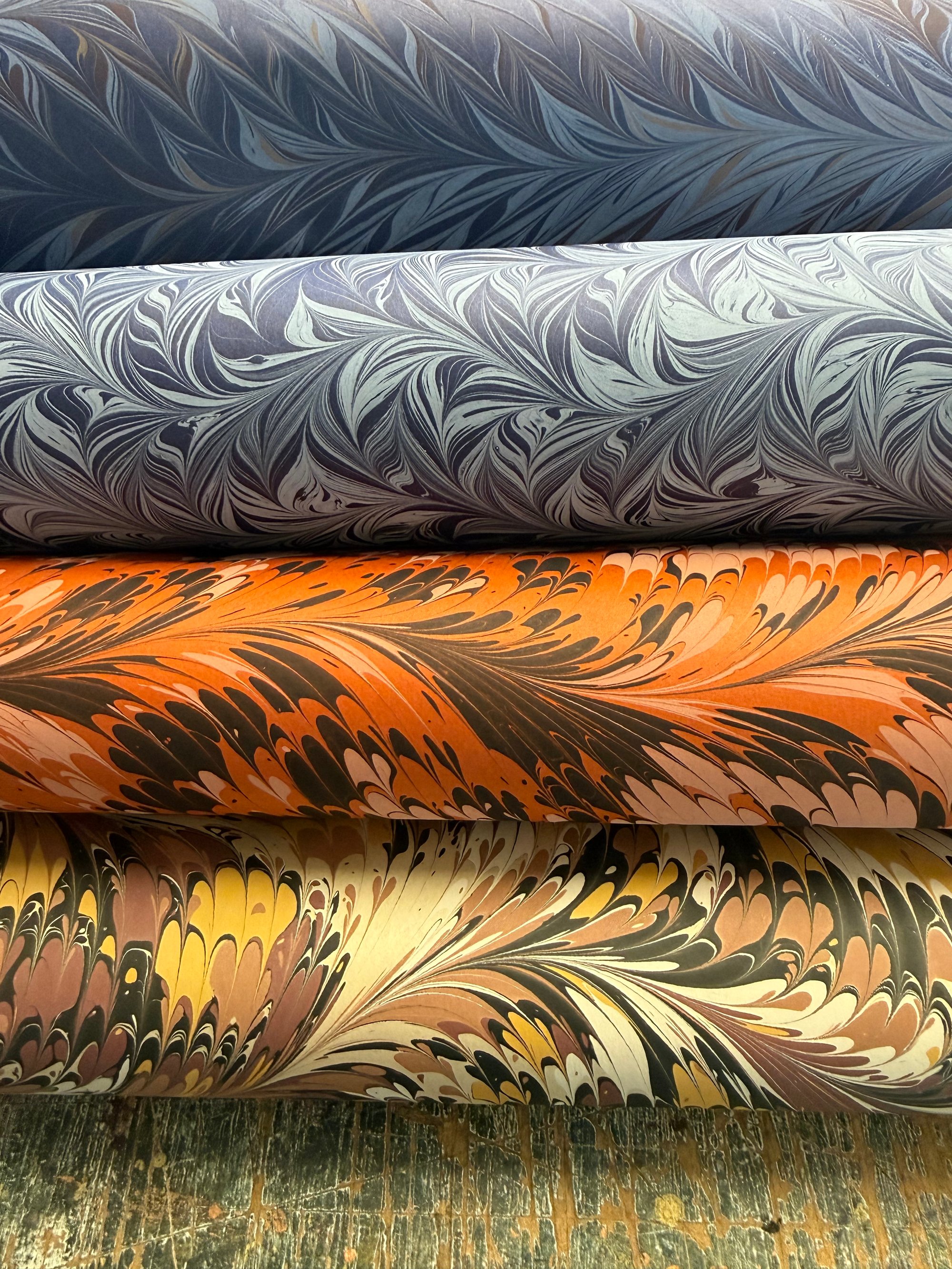 This is our opportunity to show and sell the many sheets of assorted first quality hand marbled papers that we have available. The emphasis here is on bringing you as many paper options as possible and to do this we have to keep the listings and photographs as simple as possible.