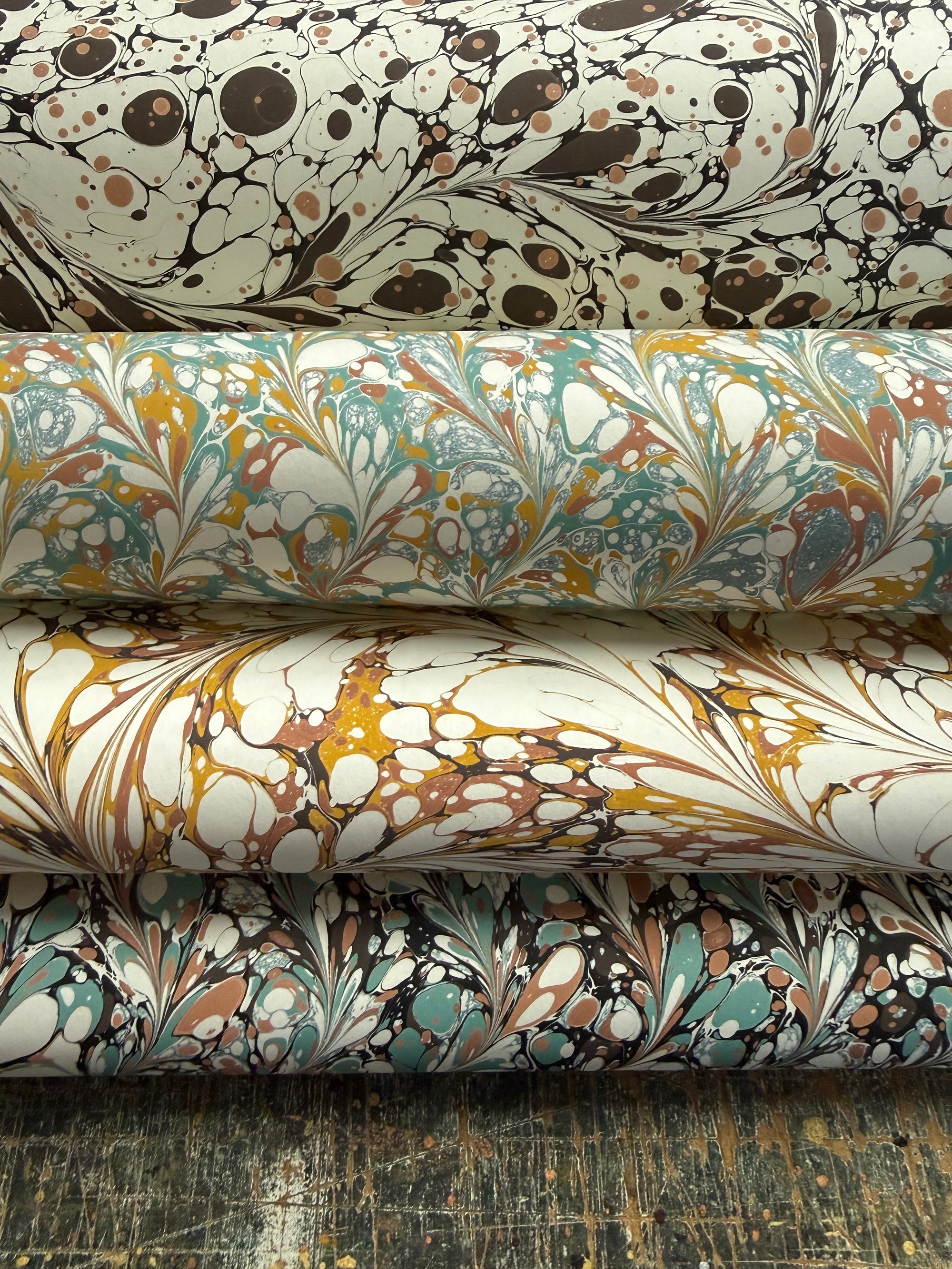 This is our opportunity to show and sell the many sheets of assorted first quality hand marbled papers that we have available. The emphasis here is on bringing you as many paper options as possible and to do this we have to keep the listings and photographs as simple as possible.