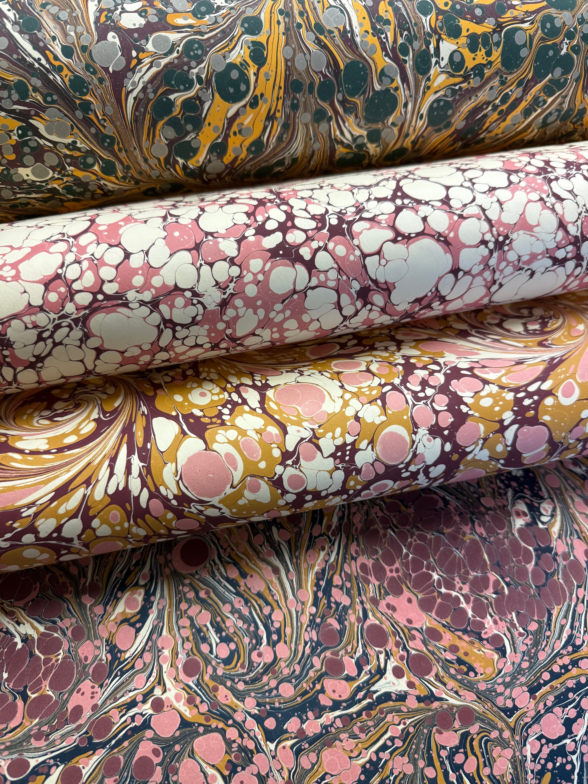 This is our opportunity to show and sell the many sheets of assorted first quality hand marbled papers that we have available. The emphasis here is on bringing you as many paper options as possible and to do this we have to keep the listings and photographs as simple as possible.