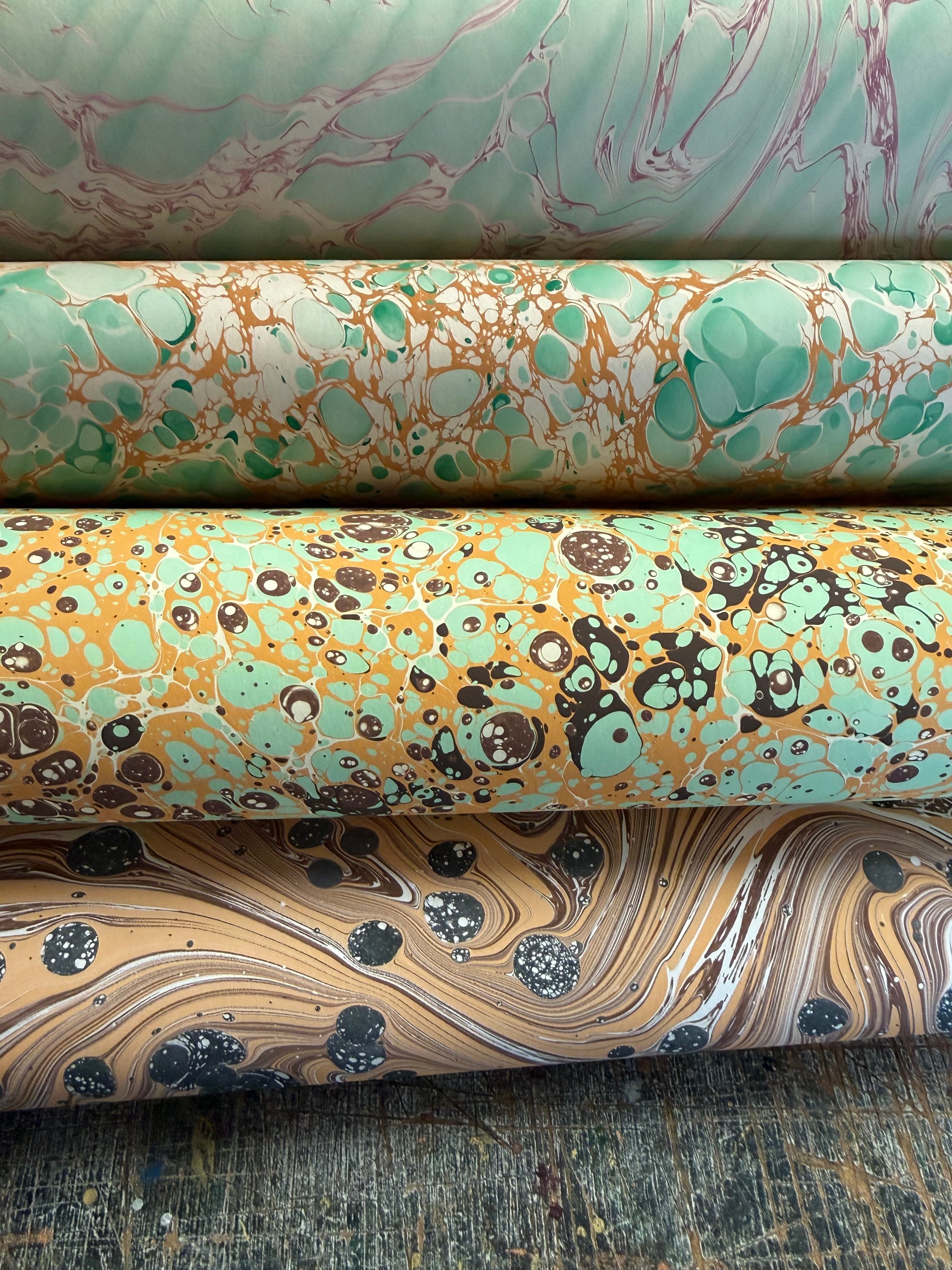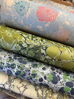 This is our opportunity to show and sell the many sheets of assorted first quality hand marbled papers that we have available. The emphasis here is on bringing you as many paper options as possible and to do this we have to keep the listings and photographs as simple as possible.