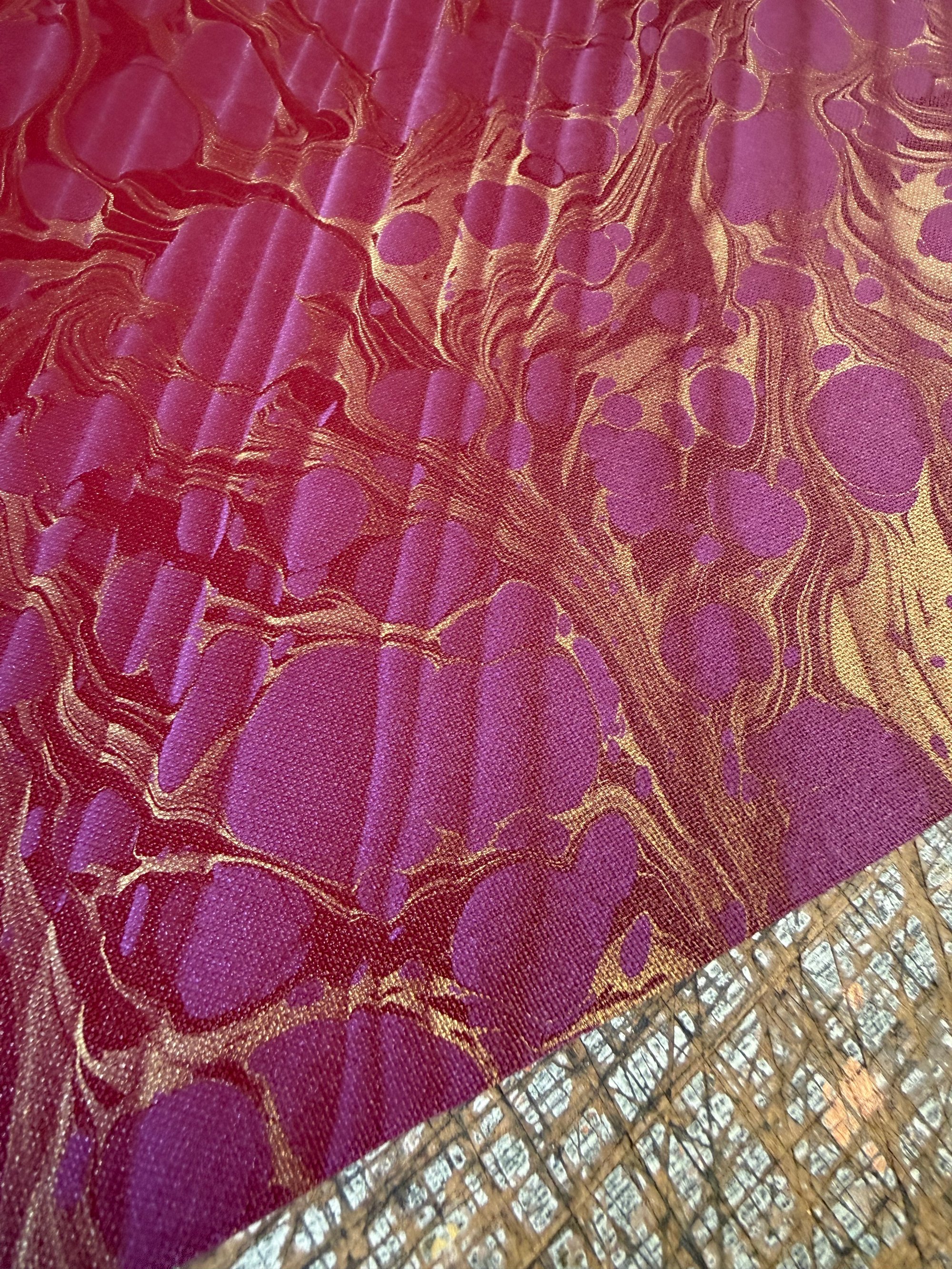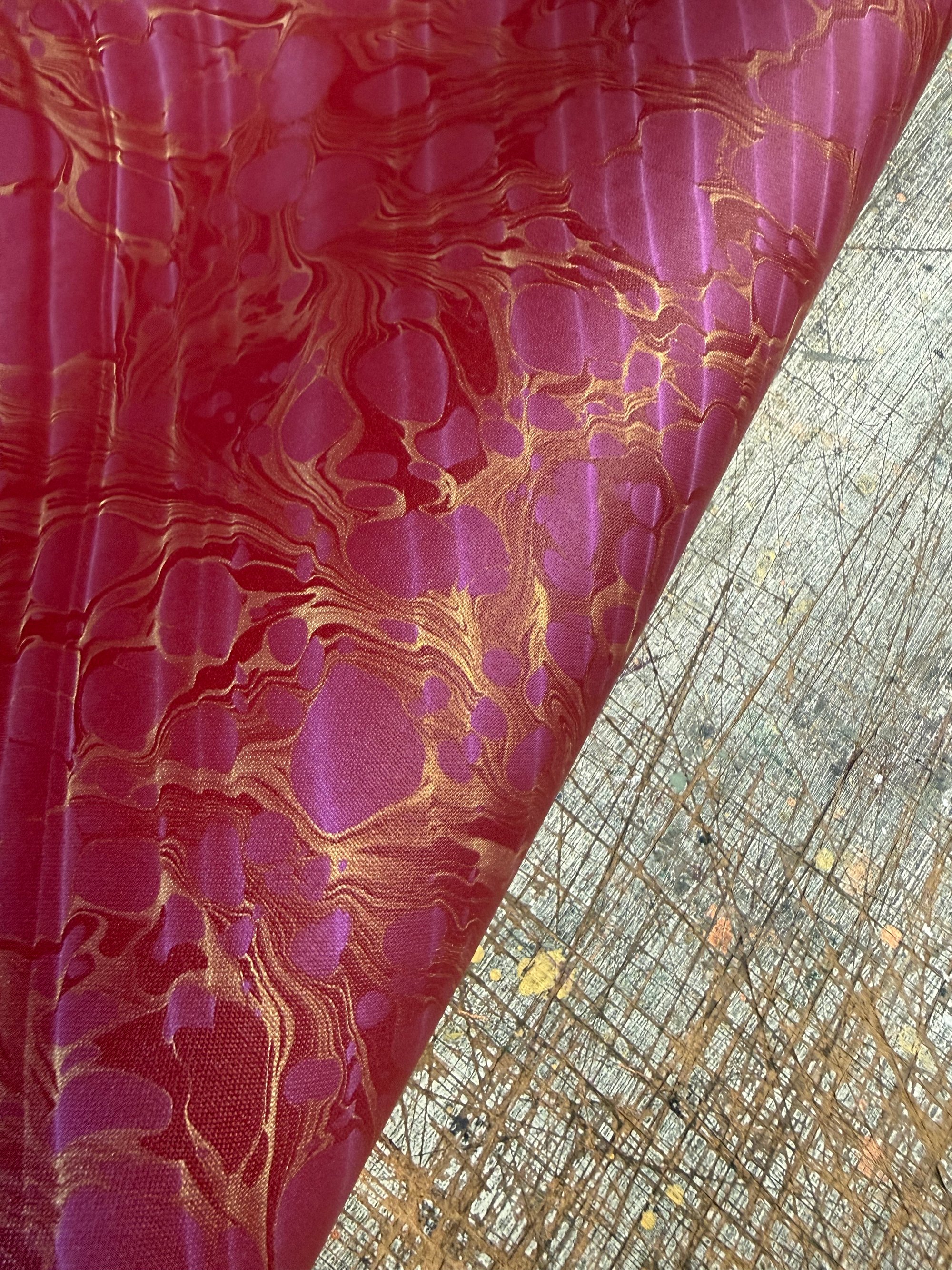 The fabric is not cut perfectly square edged and there may be a salvage edge which has also been marbled.