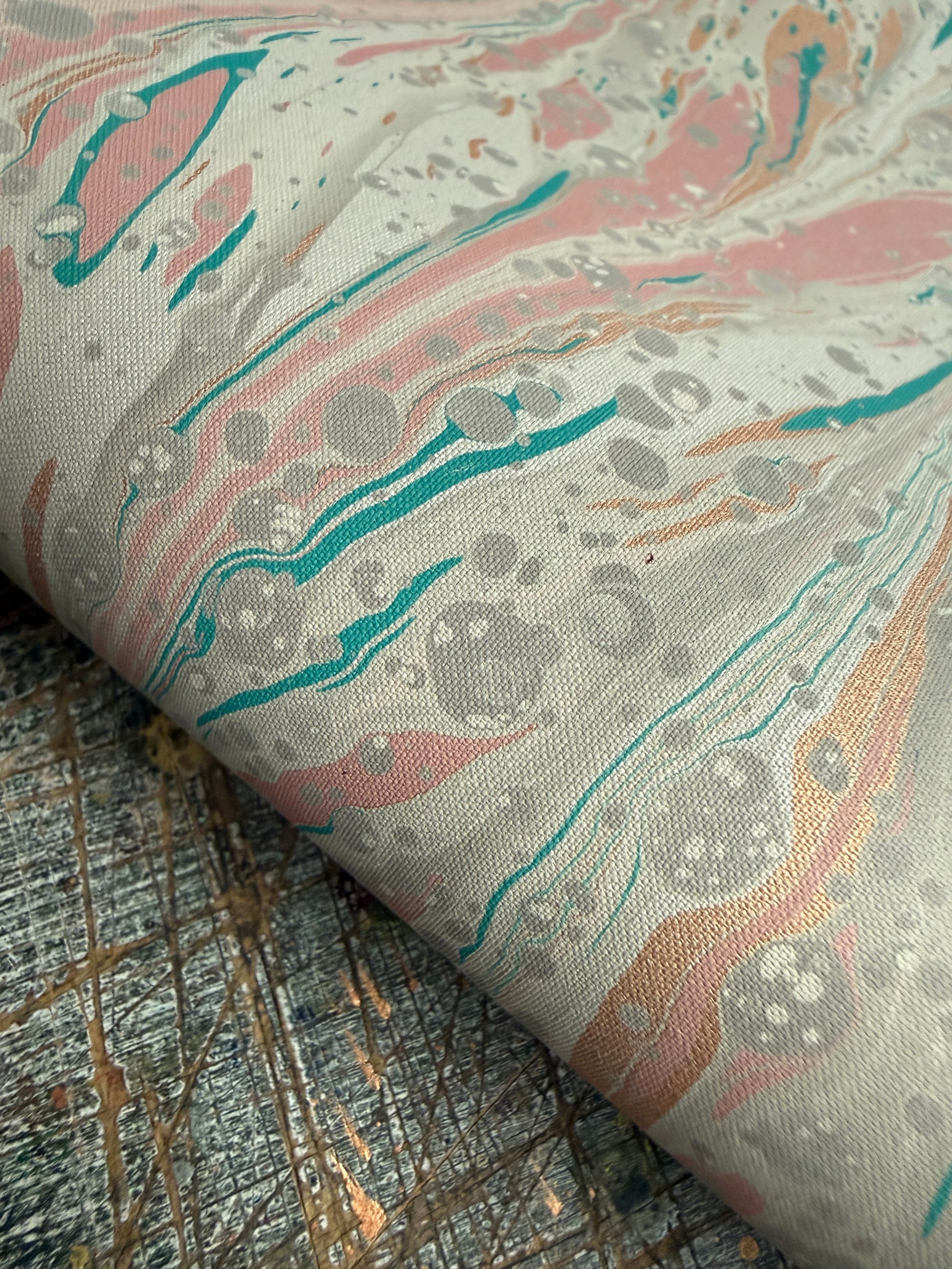 The fabric is not cut perfectly square edged and there may be a salvage edge which has also been marbled.