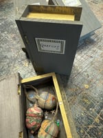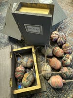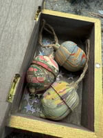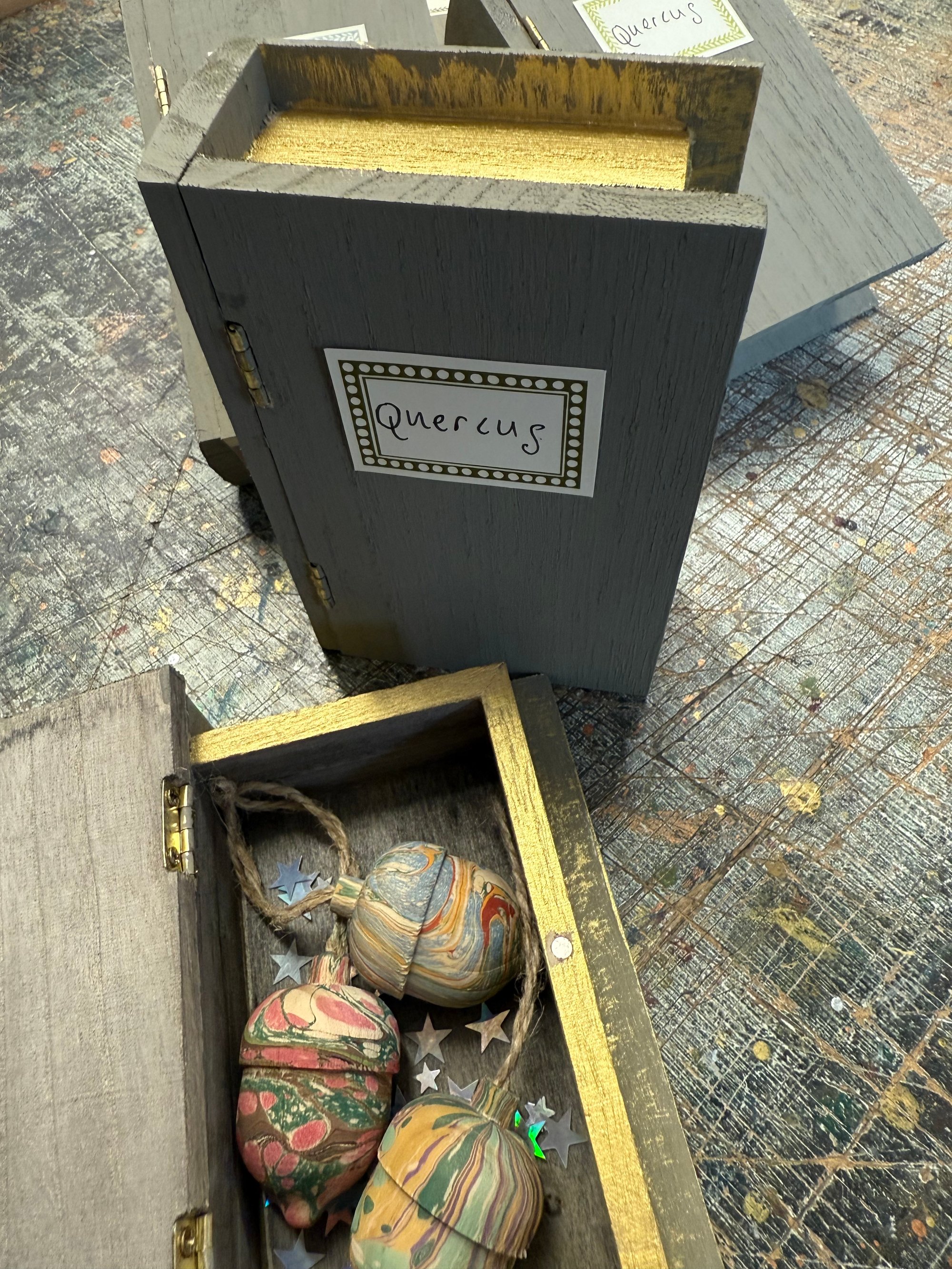Wooden box containing 3 hand marbled wooden acorns in colours inspired by Charleston Farmhouse.