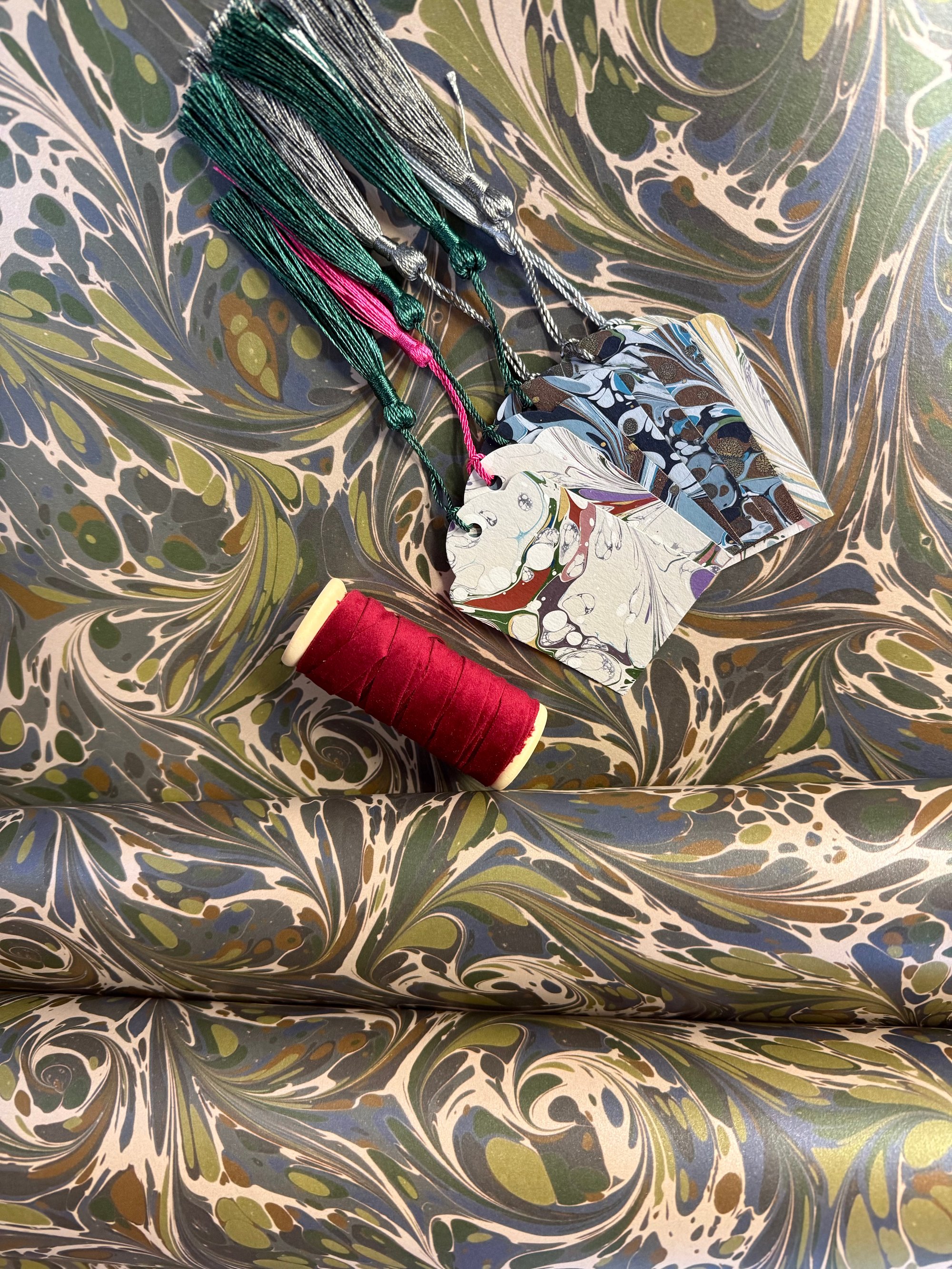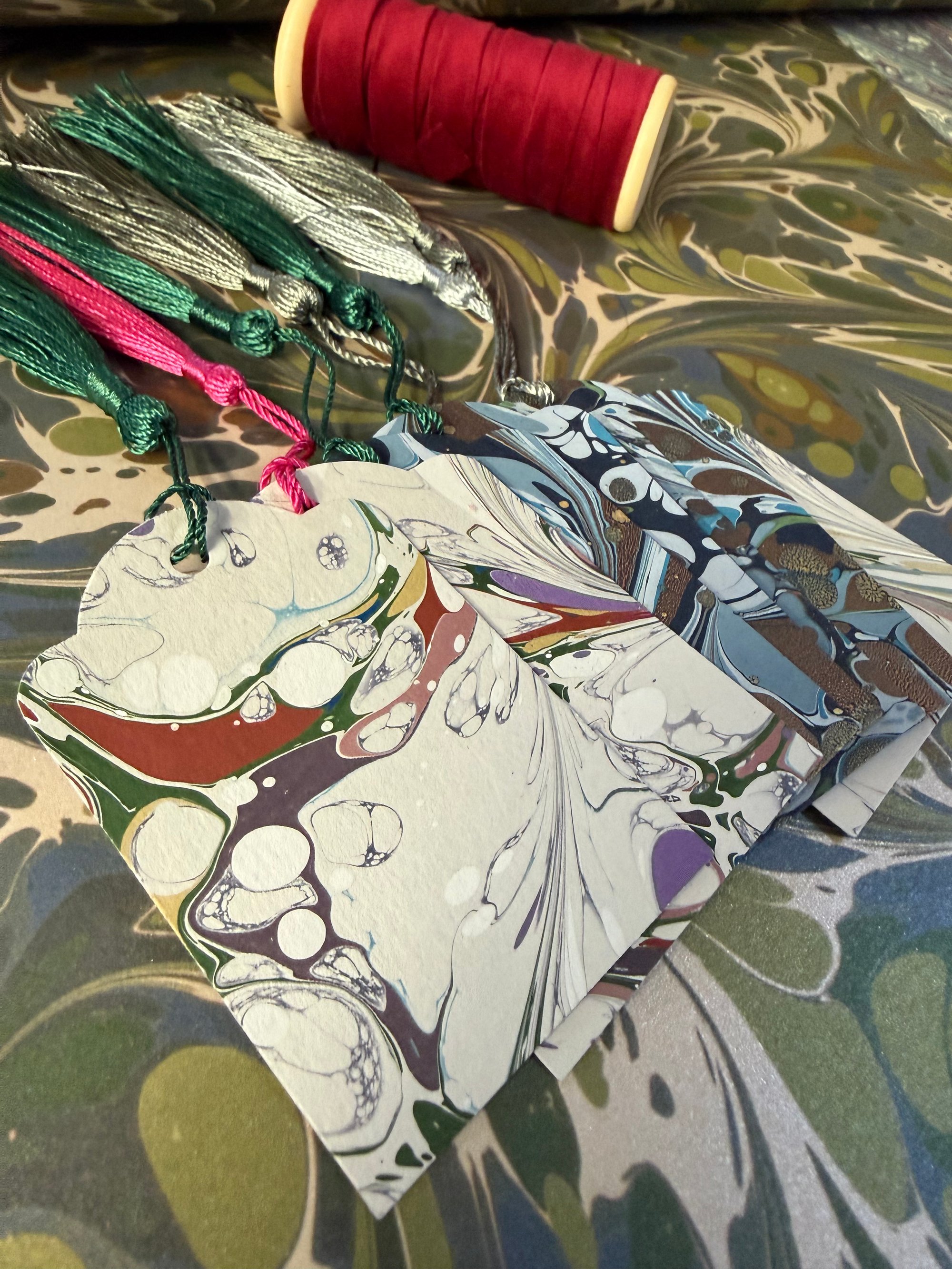 - 7 hand marbled and handmade gift tags with silky tassels