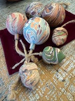 4 hand marbled round wooden baubles and 3 hand marbled wooden acorns